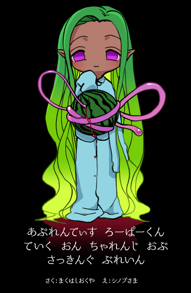 するどくとがった触手の先端が、小さめのスイカにつきささった。 そのまま中身を少し吸ってみると、汁が多くておいしかった。でも種を吸いこんじゃったらいやだから、ちょっとだけにしておこうっと。 ボクは触手をスイカから引き抜いて、ようし、とひとりごとを言った。 練習はばっちり。今日はボクが、はじめて脳をすいとるのに挑戦する日。 生まれてからいままでボクは、虫とか鳥とか、あとヒトが『おやつ』って呼んでるすばしっこいやつとかを食べてきた。でもボクも大きくなって、触手をまきつける力も強くなったし、じまんのとがった触手の先っぽも、とってもかたくてするどくなったんだ。きっとこれなら、だれかの脳をすいとることもできるはず。 いっぱい脳をすいとったら、もっと大きくなれるだけじゃなくて、とっても頭がよくなれる気がするんだ。たのしみだなぁ。 ◆ 草むらに隠れてたボクのすぐ隣に、前にヒトが『えもの』って呼んでた、耳がおおきいやつがやってきて寝ころんだ。ボクはできるだけしずかに触手をのばして、えものに近づけていく。 「ん!? わー! なんだこれ!?」 ボクはすばやく触手を動かし、うとうとしていたえものの両腕ごと、おなかをぐるりとひと巻きにして持ち上げた。『おやつ』よりもずっと重たくて、ちょっとたいへんだけど……こうすれば逃げられないから、らくちん。 あ、でも今回は『おやつ』を食べるのとちがって、脳をすいとるだけなんだった。あばれないようにしないと。 「はなせ、はなせえっ! はな、んむううっ!!」 触手をなんどもまきつけて、ぐるぐる巻き。なんかうるさかったけど、これで静かになった。よーし。集中して。 「ん゛〜〜〜! んむ゛ーーーー!」 耳の穴をねらって……いまだ! ず 「っ゛!!!」 やった! うまくできた。耳がおおきいおかげでねらいやすかったし、一気に頭の奥のほうまでさしこめた。吸ってみよう。どきどきするなぁ。 ぢゅる ずぢゅ…… 「っ゛!!」 お……おいしいっ! 脳ってこんなにおいしいんだ。スイカよりもずっと濃いかんじだけど、とってもまろやか。 くちゅ ちゅる ちゅぶ 「っん゛!!」 おいしい、おいしい……もっとたべたい……あ、なんか触手をつたって、この『えもの』のおもいでがわかる……。 ぢゅるるる ぢゅうう 「……! …………!!」 あぁ、この『えもの』、今までしあわせに生きてきたんだなあ。おいしい草をいっぱいたべて、ひなたぼっこして、群れの仲間とあそんで……。 ぢゅ ぐちゅ ちゅる 「…………」 ボク……おれ、も……このあと……おひるねしよう。おなかいっぱいで……ねむくなってきたし……。 ◆ ん……。 ふああ、とおれはあくびをした。なんでこんなとこでねてたんだっけ。まーいいや。 おなかすいた。あっちの草たべにいこっと。 「わ!?」 走り出そうとして、おれはころびそうになった。なんかおれのからだにへんなひもみたいなのがいっぱいついてる。ぶよぶよしてきもちわるいなあ。しかもなんかよくわからないのにくっついてる。 おれはひもみたいなのをひっこぬいて、おれのからだからもひっこぬこうとしたけど痛かったからあきらめて、手でかかえて走りだした。んー、おもたい。じゃまだなあ。こんなのあったっけ。 走るのも、いつもよりずっとおそいきがする。前はもっとはやかったとおもうんだけど。 ◆ ついたついた。うまそー。 もしゃもしゃと草をちぎってたべる。おいしい。おいし……あれ? なんかおいしくないようなきがする。おいしくないっていうか、あんまりたべたことないような……でもそんなわけないか。さっきもたべてたし。うまうま。 ふー、たべたたべた。ねよー。 ◆ ……がら…… 「んえ」 ……ごろ、ばりがしゃ! 「おわあ!?」 きゅうに空がひかってすごい音がして、おれはとびおきた。 ごろごろごろ! どがん! 「わーーー!!」 やだ、この音やだ! おれのきらいなやつ! あわてて耳をおさえようとしたけど、みみがなかった。 「え!?」 みみがない。っていうか、なんか小さい。 「え、え!? なんで!?」 ばり、ばりばり! 「わああーー!!」 みみがないのも、空がうるさいのも、どっちもこわすぎて、おれは逃げだした。でも、ひもみたいなやつがおもすぎる! なんでこんなのがくっついてるの! ばりごろがしゃ! 「わーーー!!」 近くに森があったから、おれはそこにかけこんでいった。ここなら空がみえないから、ちょっとこわくない。 ◆ 「はあ、はあ……」 走りにくい。はしりにくい。もう走れない。おれは森のなか、でかくてまるい草によりかかった。そしたら急に草がうごきだした! 「わああ!? んぐ!」 でかくて丸い草からのびてきた緑色のにょろにょろがおれの手と足に、それから口にもまきついた。 でかい草のてっぺんが口をあけるみたいに開いて、そっちにはこばれていく。 「んぐーー! ん゛ーーー!!」 たべられる!? なんで、草なのに! 草はおれがたべるのに! ほかのにょろにょろもうねうねうごいて、おれにせまってくる。やだ